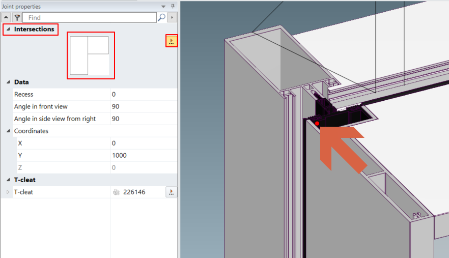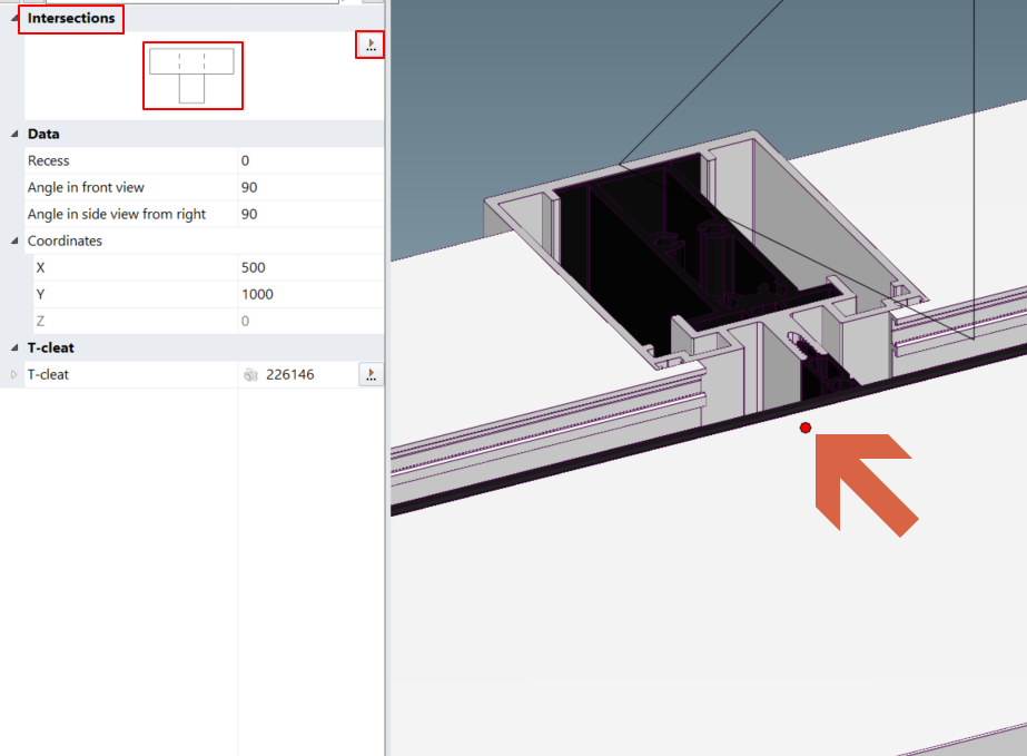 To change intersection type of 9653368 transom cover cap with mullion, select corresponding T-cleat node and use Interaction method: