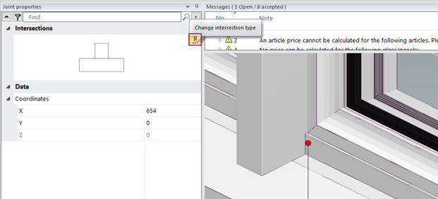 • Select the white circle representing the joint on the mullion. When it became red click Change intersection type button as on the screenshot below: