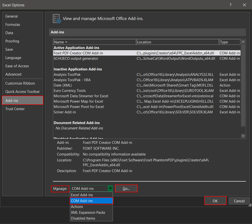 Select Add-ins and drop down Manage field. Select COM Add-ins and confirm Go…