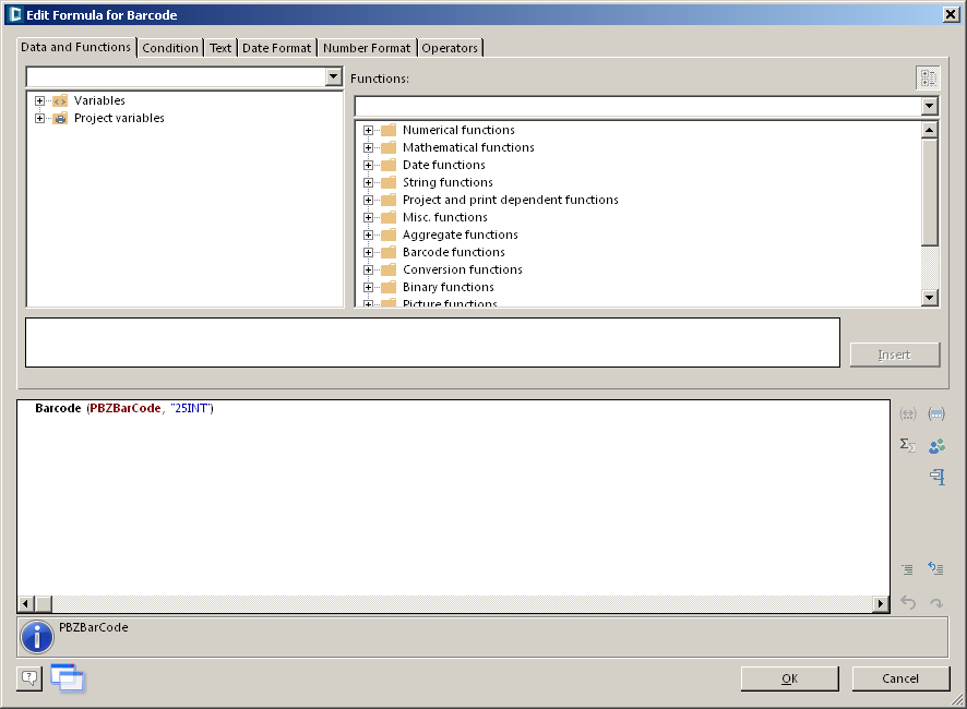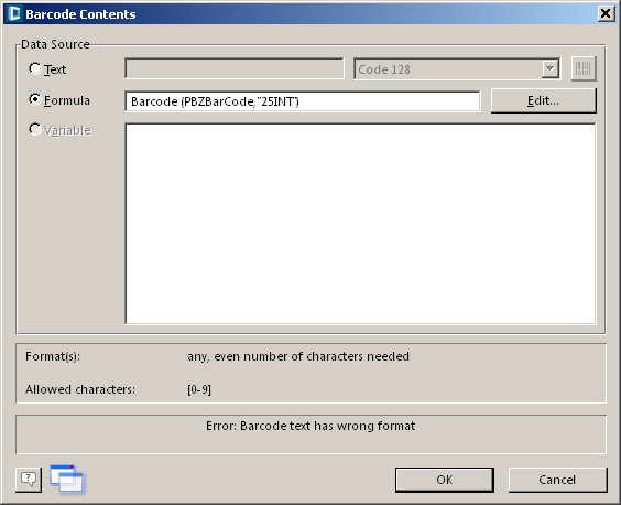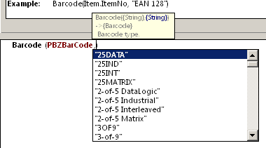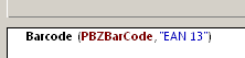 Now in formula edit area delete second parameter of Barcode function “25INT”: (do not remove closing parenthesis)
