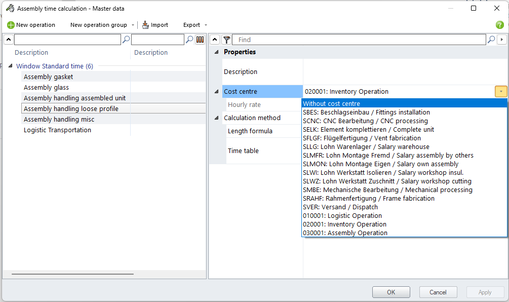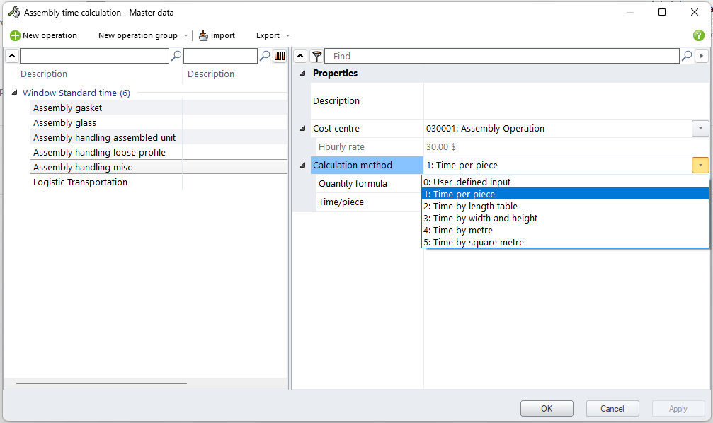 User enter assembly operations as master data. User specify the calculation method for the time calculation and the calculation basis for the cost calculation.