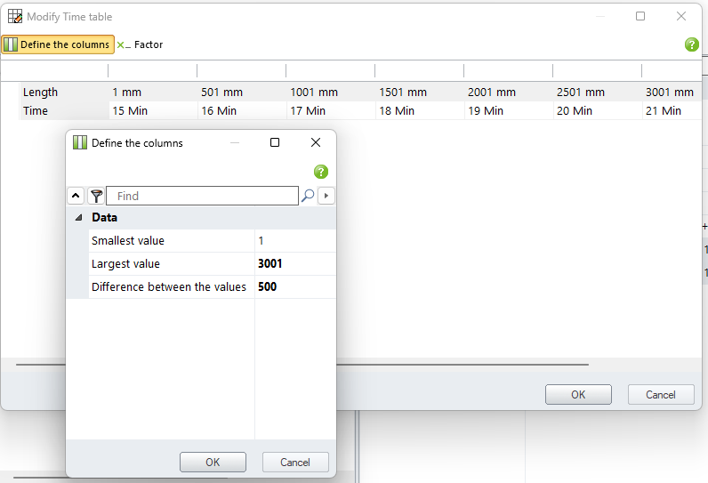 - 2: Time by length table: Edit the “length formula” and “Time table”. “Define the columns” edit the length table. Generating times automatically function is not available for this table. Need input the “Time” manually. “x_Factor” is based on the input “Time” times the “factor”, e.x. “Time”= 15 Min, “Factor” = 1.1, new “Time”= 16.5 Min.