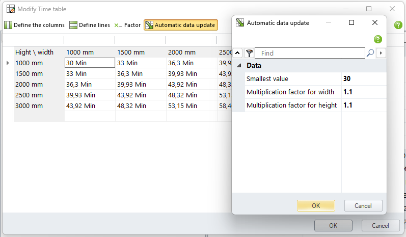 - 3: Time by width and height: Edit “Width formula” and “Height formula”. Similar as the “Time by length table”, define the columns, rows, and the factor. Generating times automatically function is available for this “Time table” by click “Automatic data update”. “Smallest value” is the top right corner time value. “Multiplication factor for width” is the factor for the rows. “Multiplication factor for height” is the factor for the column.