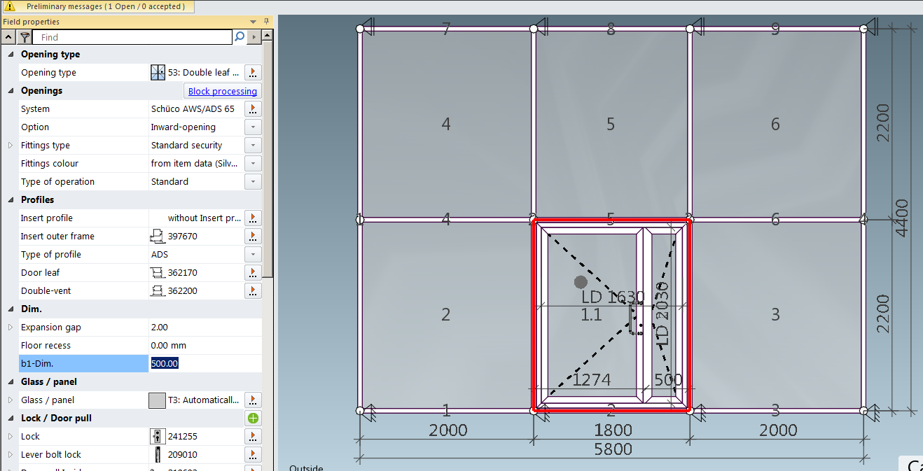 SchuCal door template set provides single and double leaf door types. Double leaf door is generated as symmetrical, however there is a simply method to change it to any asymmetrical type.