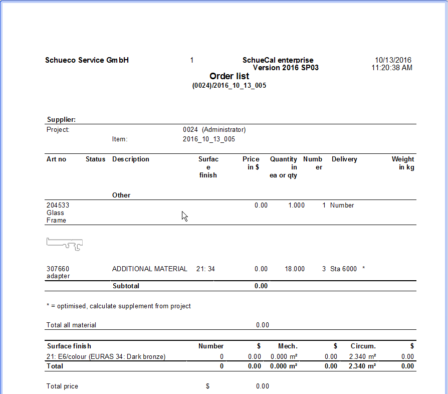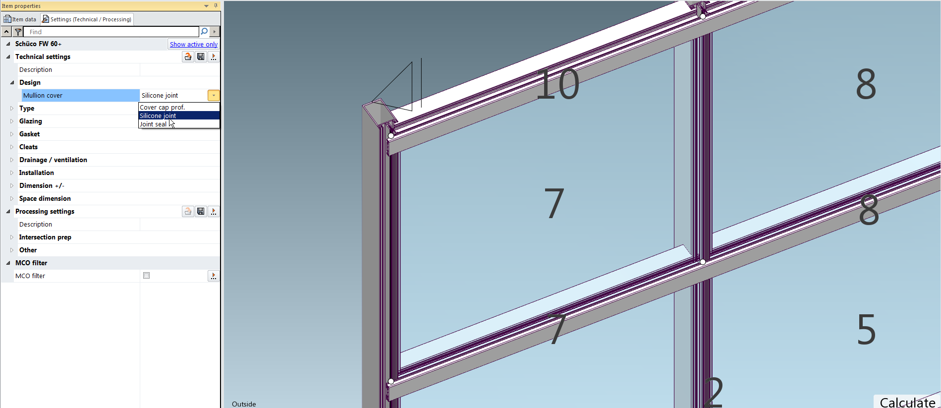 Customization is finished. Replacement gasket and adapter profile is listed now on Order list and Cutting optimization. Any change of existing façade dimensions will updater it automatically. Any new glass panels created in this facade, will need adding FW60+ 307660 / 204533 Glass Frame group to it under Additional material category.