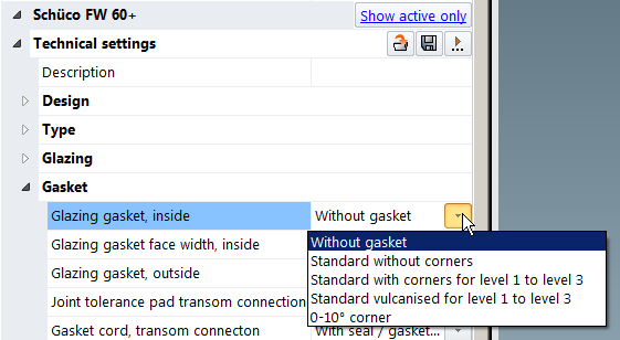 Now open Gasket category and set Glazing gasket, inside to Without gasket: