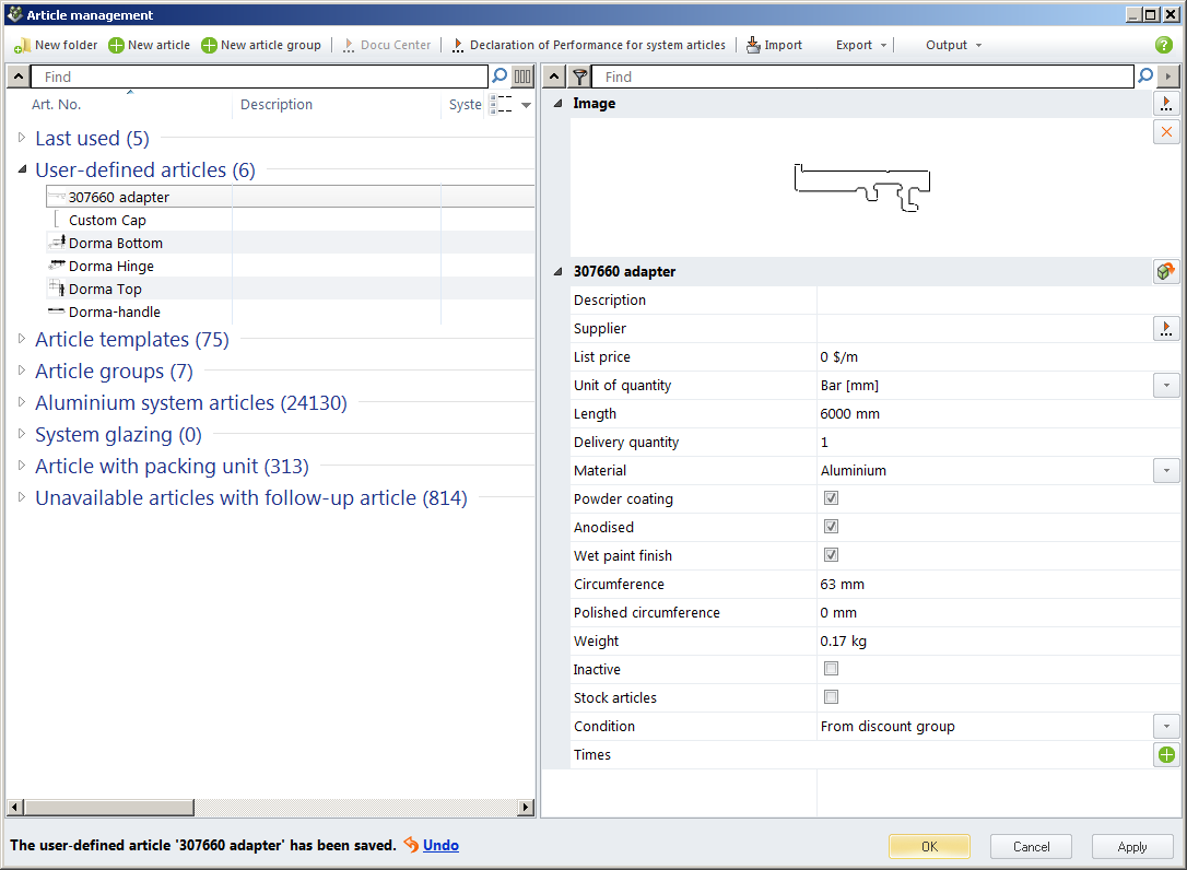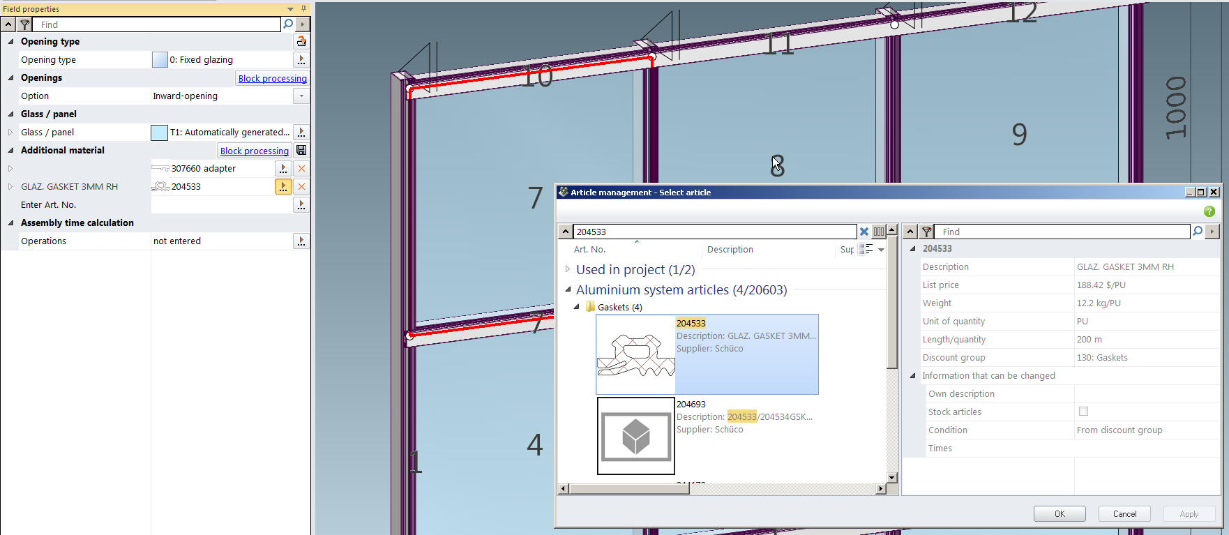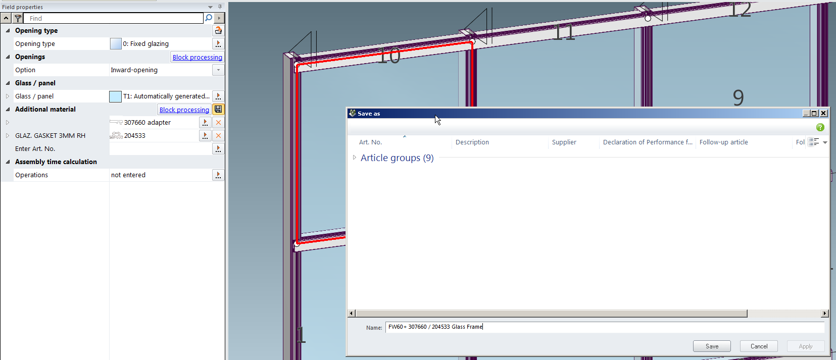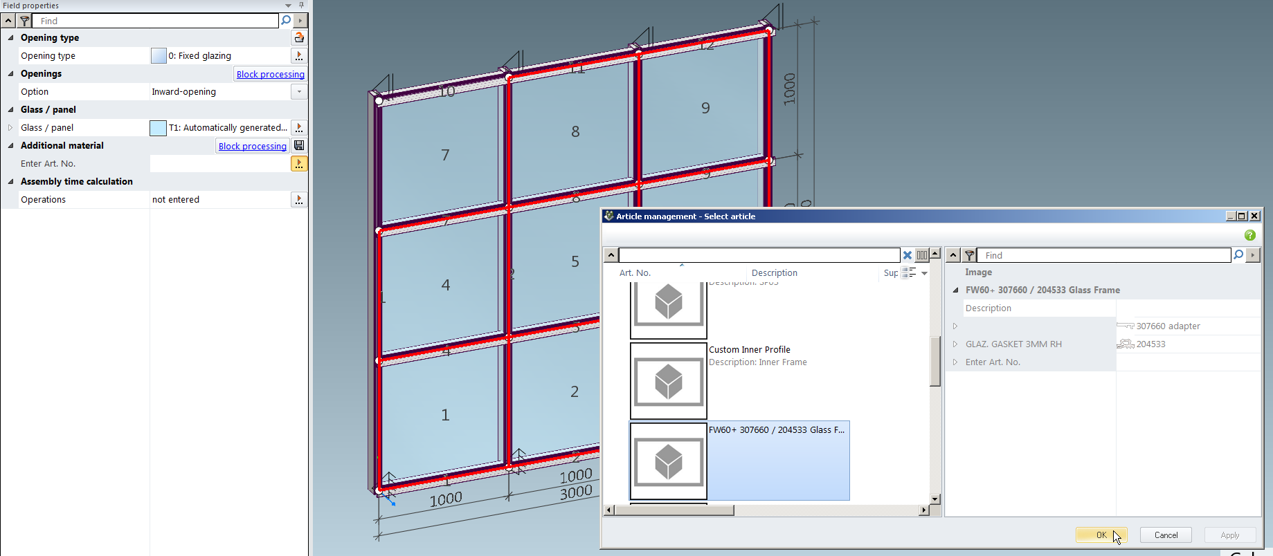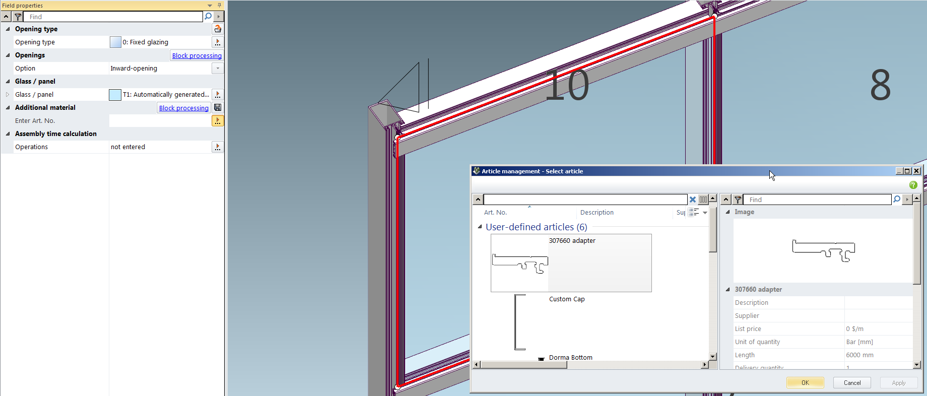 W can start configuring glazing custom frame. Click one glazing on façade and under Field properties panel open Additional material category and click button next to Enter Art. No. Navigate to User-defined articles category and pick previously created 307660 adapter: