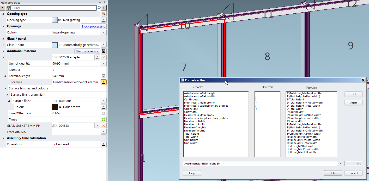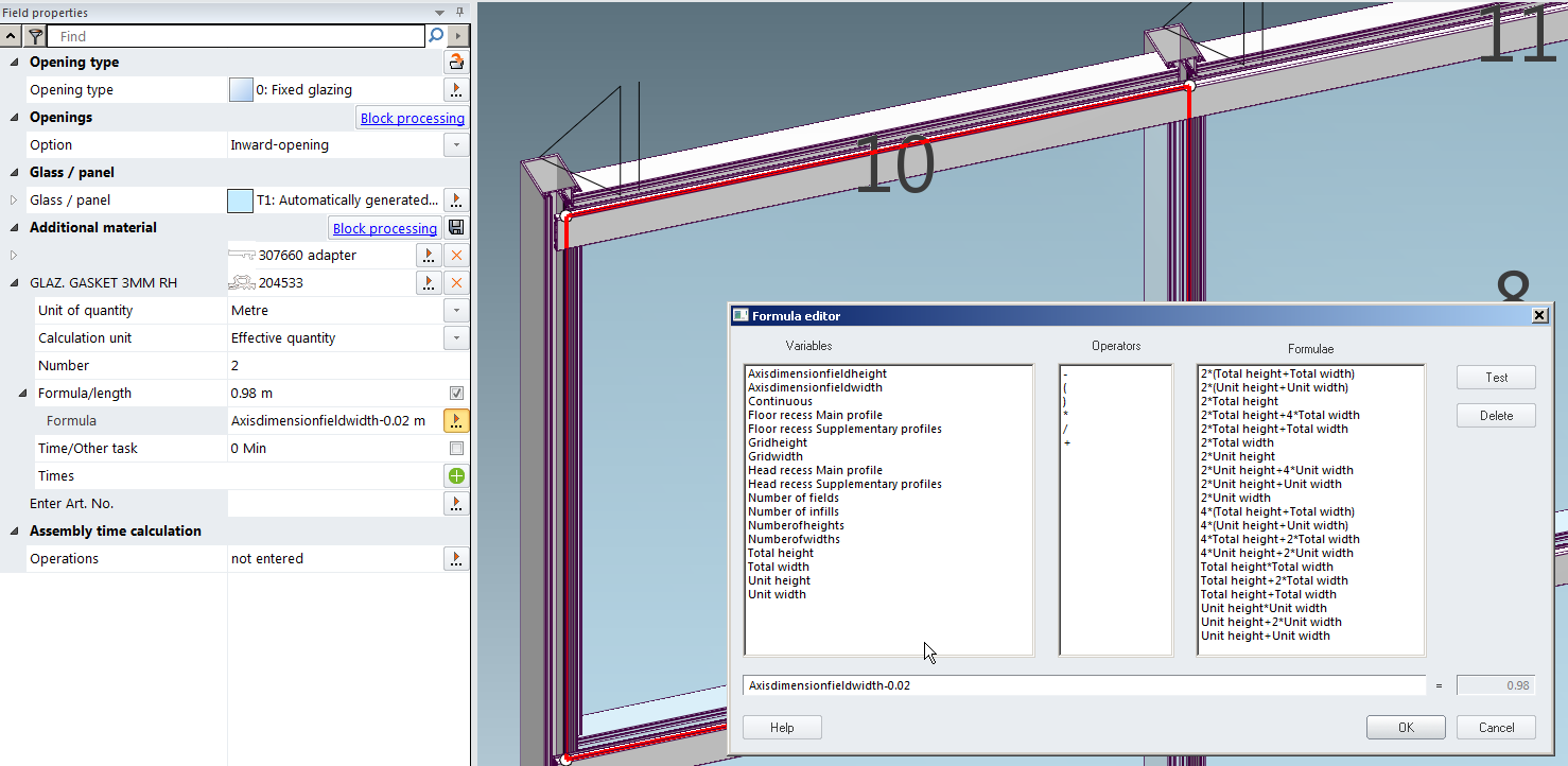 Formula editor: Axisdimensionfieldwidth-0.02 (20mm glass to glass gap expressed in meter units)
