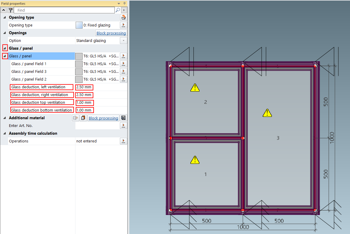 Define the correction values for Glass deduction, left ventilation as well as right, top and bottom as half value of newly designed glass panel gap. Please note that positive value increase the glass bite when negative decreases it: