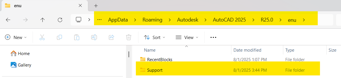 1: Rename “Support” folder as a different name, such as “Support1”. “C:\Users\XXX\AppData\Roaming\Autodesk\AutoCAD 2025\R25.0\enu“. XXX is the username.