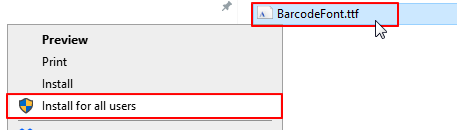 Right click on the BarcodeFont.ttf file and choose Install for all users: