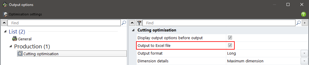 Now go to Schucal, open the project and generate some output, e.x. Cutting optimization. Before confirming the report set the check box Output to Excel file to ON: