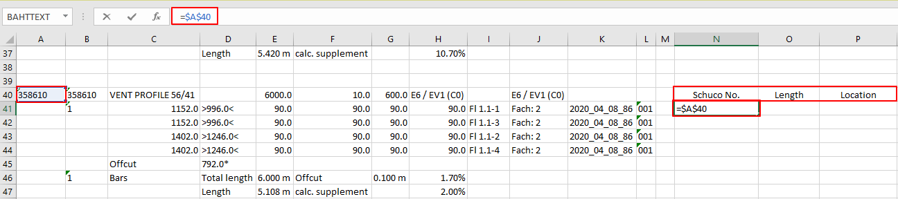 Now, to the right of the generated content create new columns and create the cell formulas populating the values from Schucal generated area. In the example below this is Schucal Number, Length and Location. You can use cell reference as relative, that will copy the values from same row after copying formulas (Length) or absolute with dollar sign prefix ($) that will always refer to fixed position of the list (Schuco Number in this example). Populate the cells accordingly: