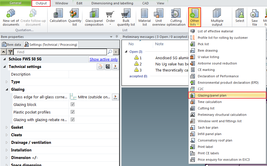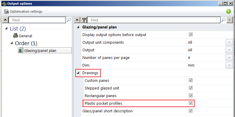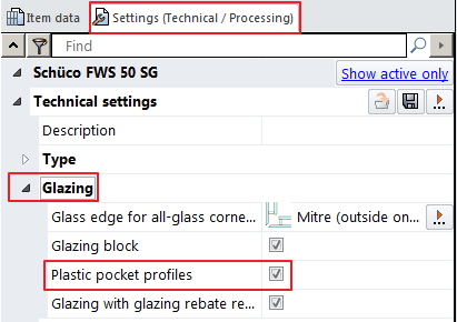 Technical Settings > Glazing > Plastic pocket profiles > ON