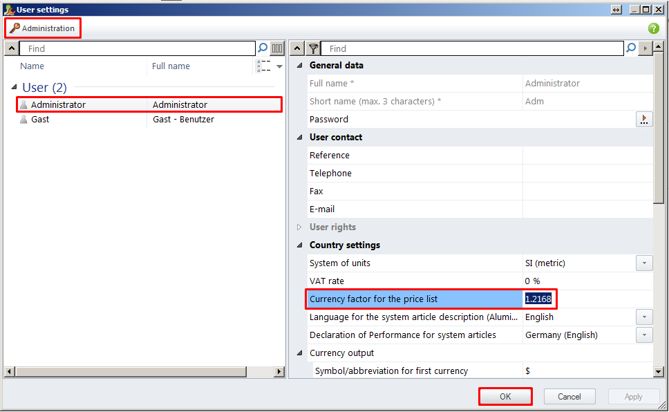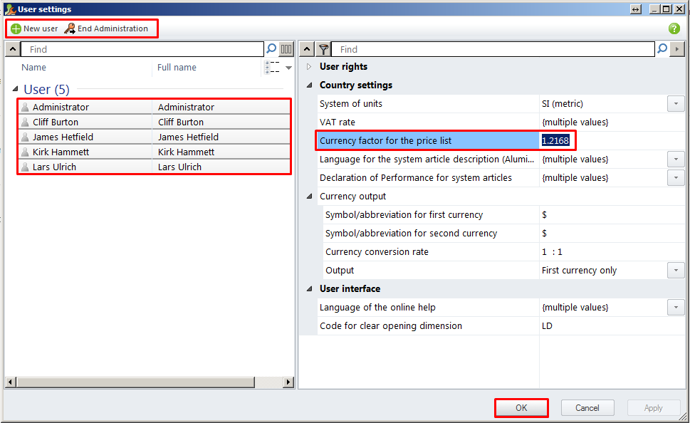 Select all users on the list (By clicking them while holding Control key or typing combination Control+A). Now Administrator can update conversion rate for all users in one Currency factor for the price list field (expressed as #.#### decimal value).
