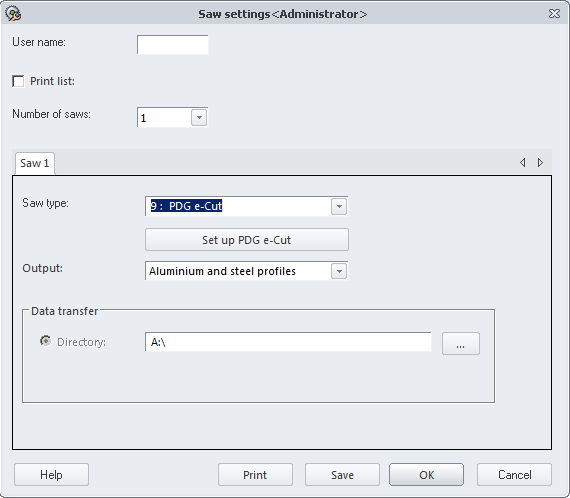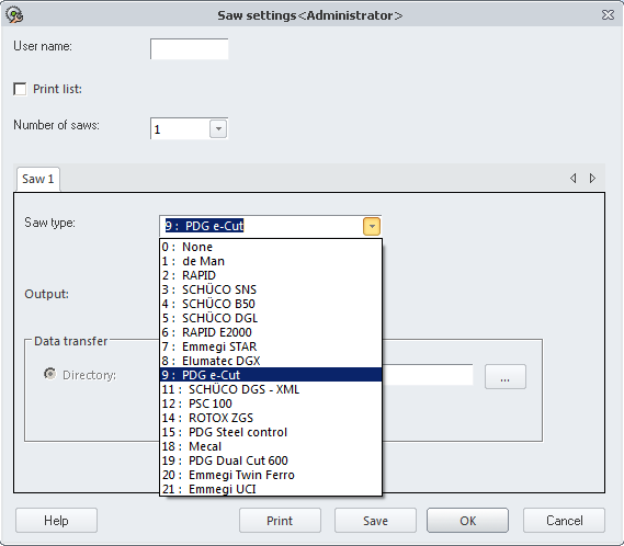 By selecting a saw, you define the output format. The various saw types are offered for selection in the drop-down list. If the saw you are using is not offered, select the saw type with the same output format as that of your saw.