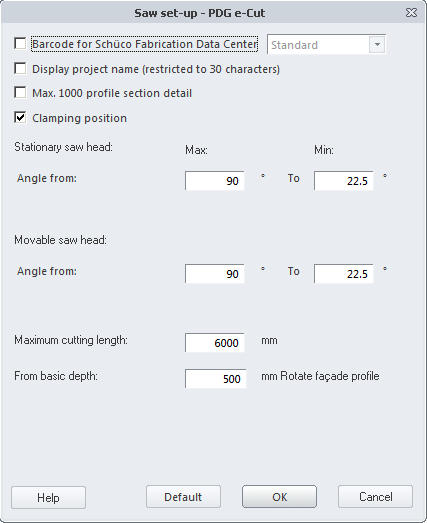 - If you click on the Default button, all fields are filled with the standard defaults for the saw type which is currently selected.