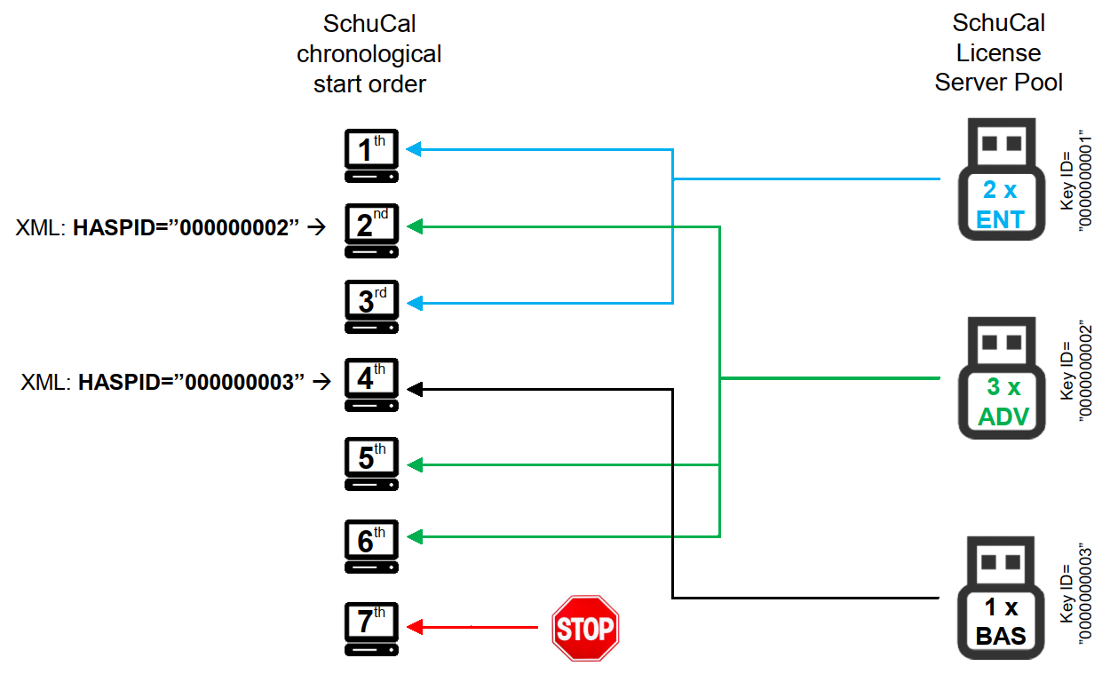 We can do that by configuring Schucal to use particular license dongle Hasp ID, what is the unique identification number of license dongle.