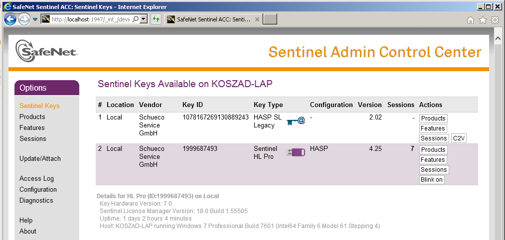 You will have SafeNet server interface open. Go to Sentinel keys and select Hasp dongle key that has features necessary for you. Hasp ID number will be displayed in Key ID column: