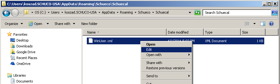 Navigate now to Schueco\Schuecal and open WinUser.xml in edit mode (Right mouse button > Edit):