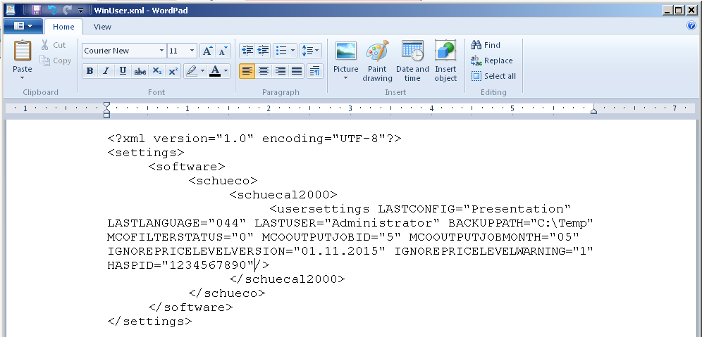 Now, open the file: %appdata%\Schueco\Schuecal\WinUser.xml