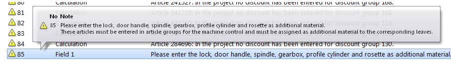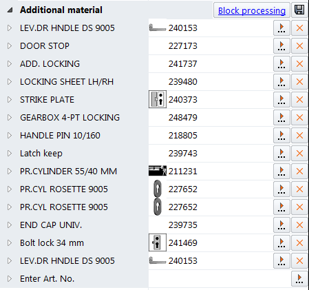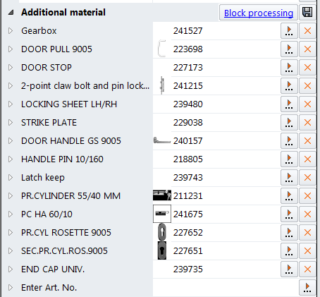 In ASS FD system user have to manually choose lock, door handle spindle, gearbox, profile cylinder and rosette as additional material. Articles must be chosen form same article group (Sliding door) and assigned to corresponding leaves.