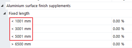 In the conditions, new input fields are available for the following Fixed lengths under the Aluminum surface finish supplements group: