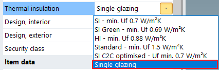 As of this version, the entry Single glazing can be selected for the unit parameter Thermal insulation for units in the Schüco FWS 50 und Schüco FWS 60 systems. Single glazing of 4-14 mm is possible with this selection.
