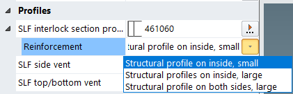 As of 2019 R2 SP01, the reinforcement option can be selected from a drop-down list in the Field properties dialog box when selecting the SLF interlock section profile (Structural profile on inside, small; Structural profile on inside, large; Structural profile on both sides, large).