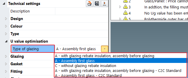 Technical settings > U value calculation group > Type of glazing