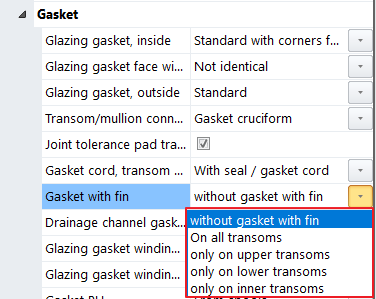 The technical setting Gasket on one side has been renamed Gasket with fin. As of this version, there is a drop-down list with the following selection options: