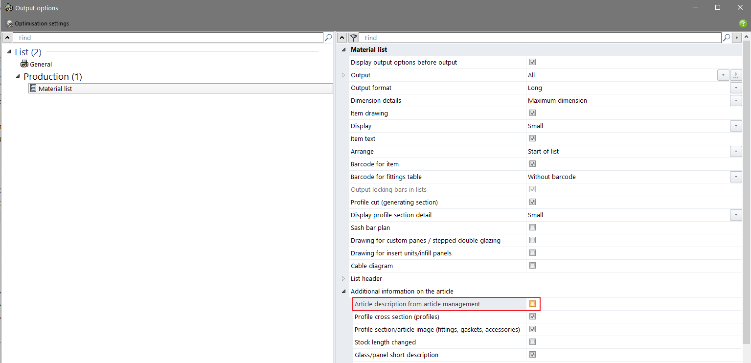 As of this version, you can find the new feature Article description from article management in the output options for the material list under the Additional information on the article group. If you activate this check box, the article descriptions from the article management are output for the articles instead of the purposes.
