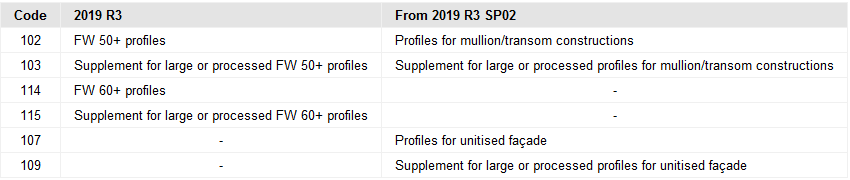 - Discount groups 102 and 103 have been renamed and, from article data update 12/2019 onwards, are valid for profiles previously calculated using discount groups 114 and 115.