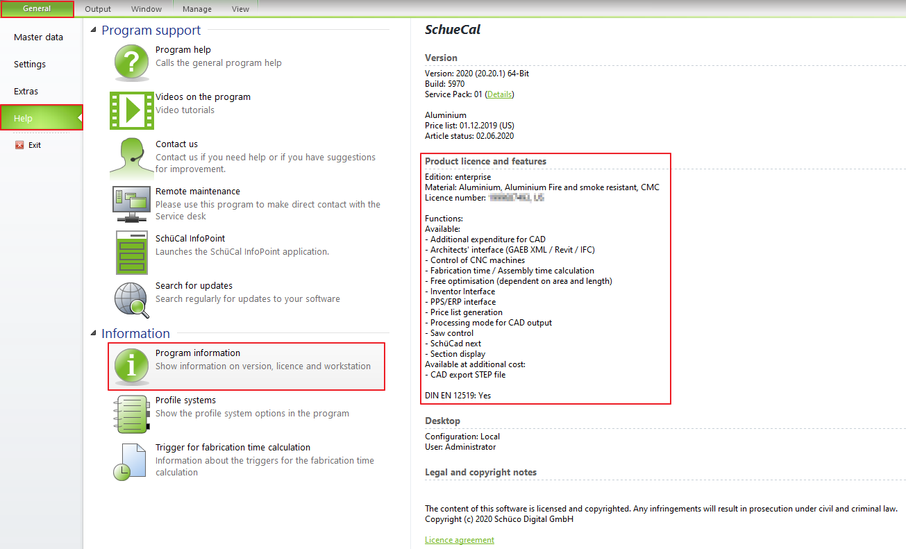 As of this version, information about the functions used and options available for the workstation are listed under the heading Product license and features on the Help tab (menu ribbon: General > Help > Program information).