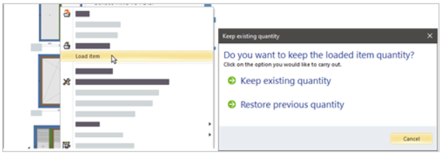 An existing item can be replaced with another item that has already been created. Using the Load item context menu command, the copy of the loaded item replaces the previously selected item. The item number and description of the selected item remain unchanged.