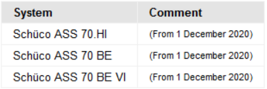 The following systems will be removed from the Schüco range as of 1 December 2020 and will subsequently no longer be available in the program for new items.