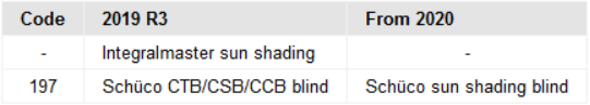 - The Integralmaster sun shading discount group has been removed. These articles are now calculated under Schüco discount group 197.