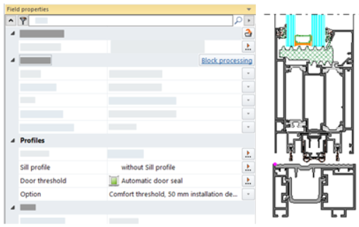 As of this version, the adjustment device (combination of Art. No. 502910 and Art. No. 502920) can be calculated for side outer frames instead of adapter profile Art. No. 468010 The new property for this, Adjustment device for SLF side outer frame, can be found under the Type group. The option Without adjustment device is preset there.