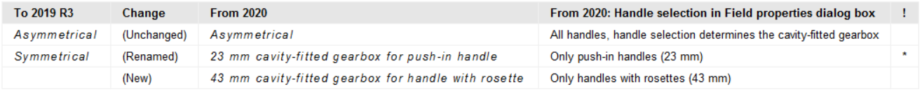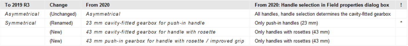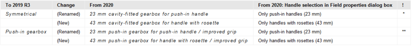 * = If you had the technical setting Symmetrical in existing items, and had selected a 43 mm handle in the item, the article number of the cavity-fitted gearbox will change and the handle will change to a 23 mm push-in handle.