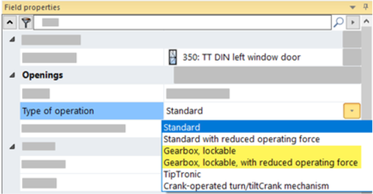 In the technical setting, the options for the SimplySmart cavity-fitted gearbox have been changed. In the previous versions, the handle selection in the field properties determined the article number of the cavity-fitted gearbox. As of this version, the new and renamed selection options mean that you determine the article number of the cavity-fitted gearbox. The selection you make determines which window handles are offered in the Field properties dialog box.
