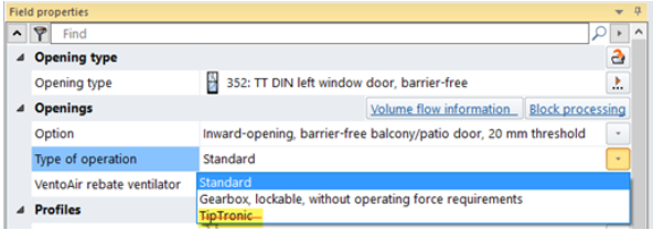 In the previous version, for opening types 352: TT DIN right window door, barrier-free and 353: TT DIN right window door, easy-access, the TipTronic entry can be selected as the Operating type in the version Inward-opening, easy-access balcony/patio door, 20 mm threshold.