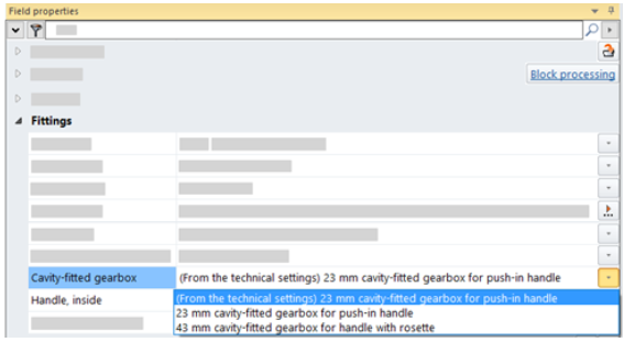 As of this version, your default settings for the cavity-fitted gearbox are copied over from the technical settings (Fitting group > SimplySmart cavity-fitted gearbox) over to the Field properties for an opening. There you can amend the setting for the specific field as required. Using these settings for the cavity-fitted gearbox, you can determine which handles are available for selection.