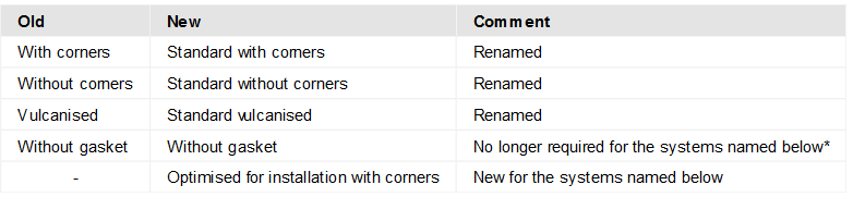 * = Please note for existing items: If you had selected the setting Without gasket in the named systems, the calculation will now be made according to the setting Standard with corners.