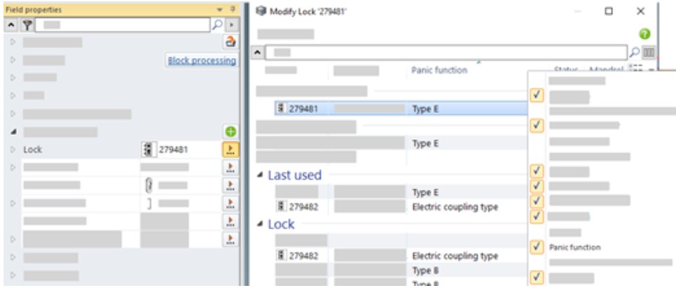 As of this version, door locks which can be coupled electrically with the outer door handle are labelled with the Electric coupling type panic function. In the article selection dialog box for the lock, you can filter the locks by means of the Panic function column.