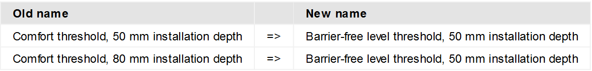The property in the technical settings under the Design group for sealing the transition between the comfort threshold and the automatic door seal has also been renamed (Attachment of comfort threshold => Attachment of barrier-free level threshold).