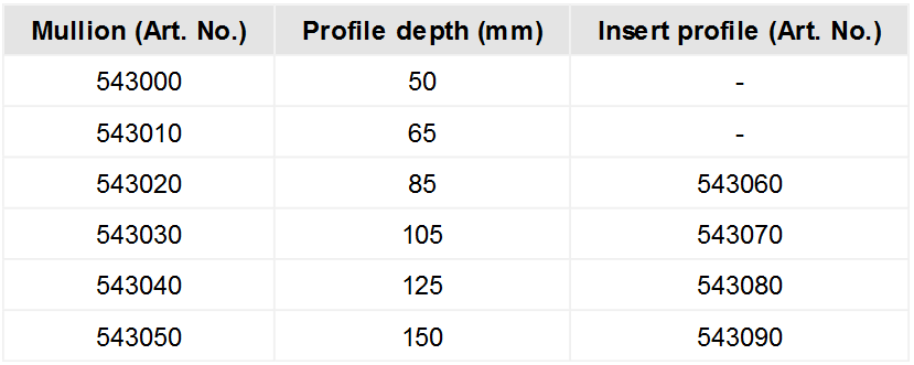 The following new article numbers for the mullions and insert profiles with lengths of 6.50 meters can now be selected in the program.