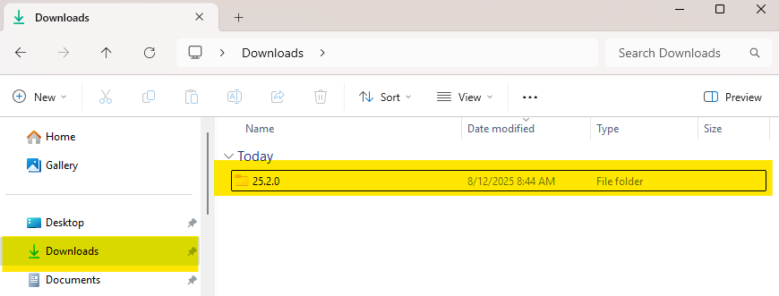After the download process is finalized, please navigate to destination folder you confirmed earlier (default folder is Downloads) and find the folder with corresponding version, with syntax YY.R.0, where Y stands for Year version and R stands for revision number. The screenshot below shows installation folder 25.2.0 that consist of downloaded version 2025 R2: