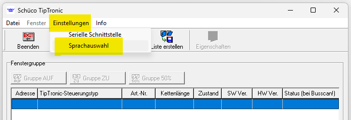 In the “Schuco Tiptonic“ window top menu. Click on “Enstellungen” (Setting), and “Sprachauswahl” (Language).
